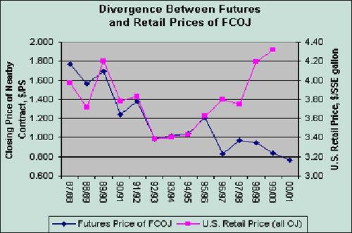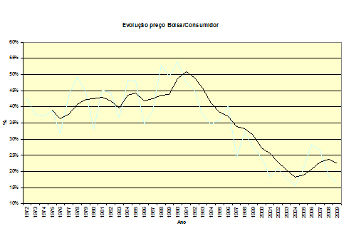 O gráfico demonstra que o preço do suco ao consumidor e o preço do suco na Bolsa seguiam a mesma tendência até o inicio da década de 90, quando a cartelização do setor provocou o descolamento dos preços. Os preços do suco ao consumidor aumentaram enquanto o preço do suco na Bolsa, que baliza o preço do suco a granel e a remuneração do citricultor caíam. Este movimento que continua até os dias atuais, como se vê no gráfico abaixo onde o preço do FCOJ que correspondia a cerca de 50% do preço final do suco ao consumidor no inicio da década de 90, passou a corresponder a cerca de 17%, e teve como conseqüência um grande aumento de margens para os demais elos da nossa cadeia produtiva às expensas do citricultor e do consumidor.