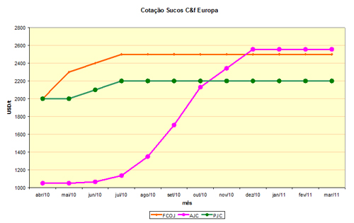 Abaixo, mostramos a curva de evolução dos preços dos três principais sucos de fruta, onde podemos observar que o suco de laranja, apesar de suas vantagens acima mencionadas e seu custo maior de produção e distribuição, por ser congelado, ainda é comercializado com preço inferior ao do suco de maçã e um pouco superior ao do suco de abacaxi que é um subproduto da conserva de abacaxi.
