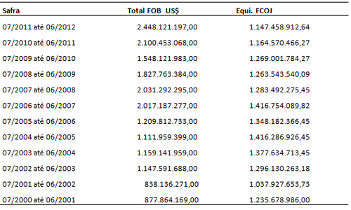 No Brasil, embora o volume de suco de laranja exportado se tenha mantido constante no período de 2000-01 a 2011-12, o valor registrado nas exportações, como se vê no quadro abaixo, cresceu 180%, de US$ 878 milhões para US$2,45 bilhões, enquanto os preços pagos aos citricultores caíram de cerca de US$ 2,3 em 2000-01 para US$ 1,37 por caixa na safra passada. Uma redução de 40%, agravando ainda mais o prejuízo do citricultor, que tem um custo de produção superior a 9 dólares.