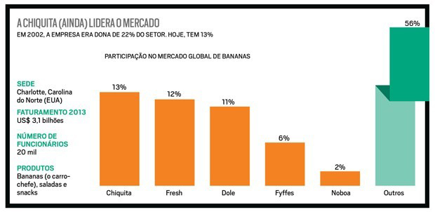 Em 2002, as cinco principais empresas detinham 70% do mercado global de bananas. Hoje, esse índice é de 44%
