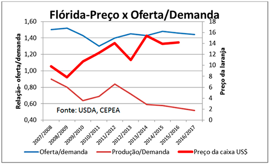 Dados recentes demonstram que apesar de a indústria propagar a contração da demanda para justificar a baixa remuneração aos citricultores brasileiros, onde os preços publicados pelo CEPEA no período 2007/2008 a 2015/2016 indicam uma queda de US$ 5,97/cx para US$3,8/cx, nesse período a queda de produção superou a queda de demanda. O que se confirma pela elevação da cotação do FCOJ de US$1775/t em julho de 2008 para US$2300/t em julho de 2016.